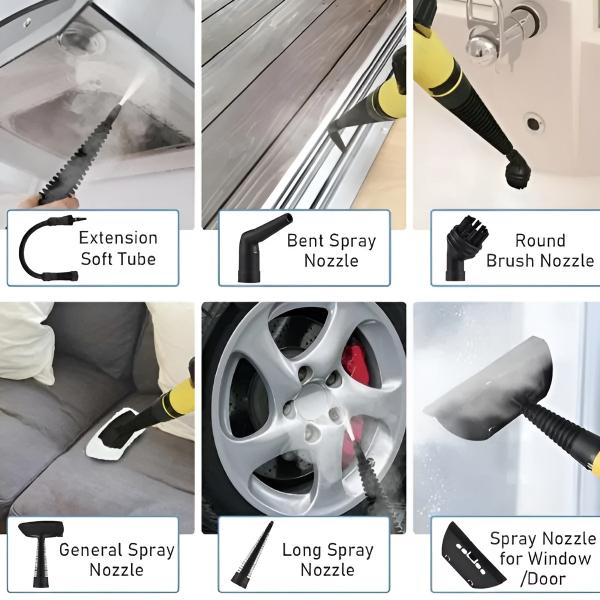 Include spazzole, ugelli e cuscinetti per la pulizia di pavimenti, stucchi, finestre e altro ancora.